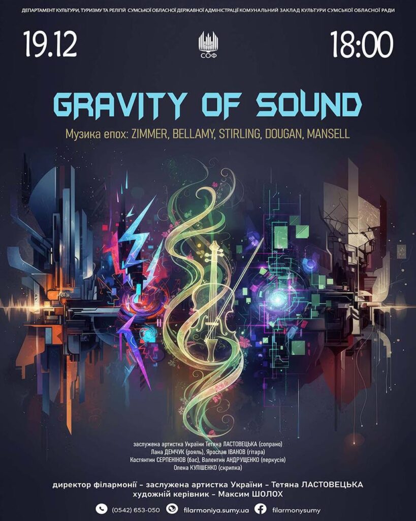 Запрошуємо вас на захопливий музичний проєкт — концерт «GRAVITY of SOUND»! Це подорож крізь епохи сучасної світової музики, натхненої творчістю Hans Zimmer, Matthew Bellamy, Lindsey Stirling, Paul Dougan, Clint Mansell...