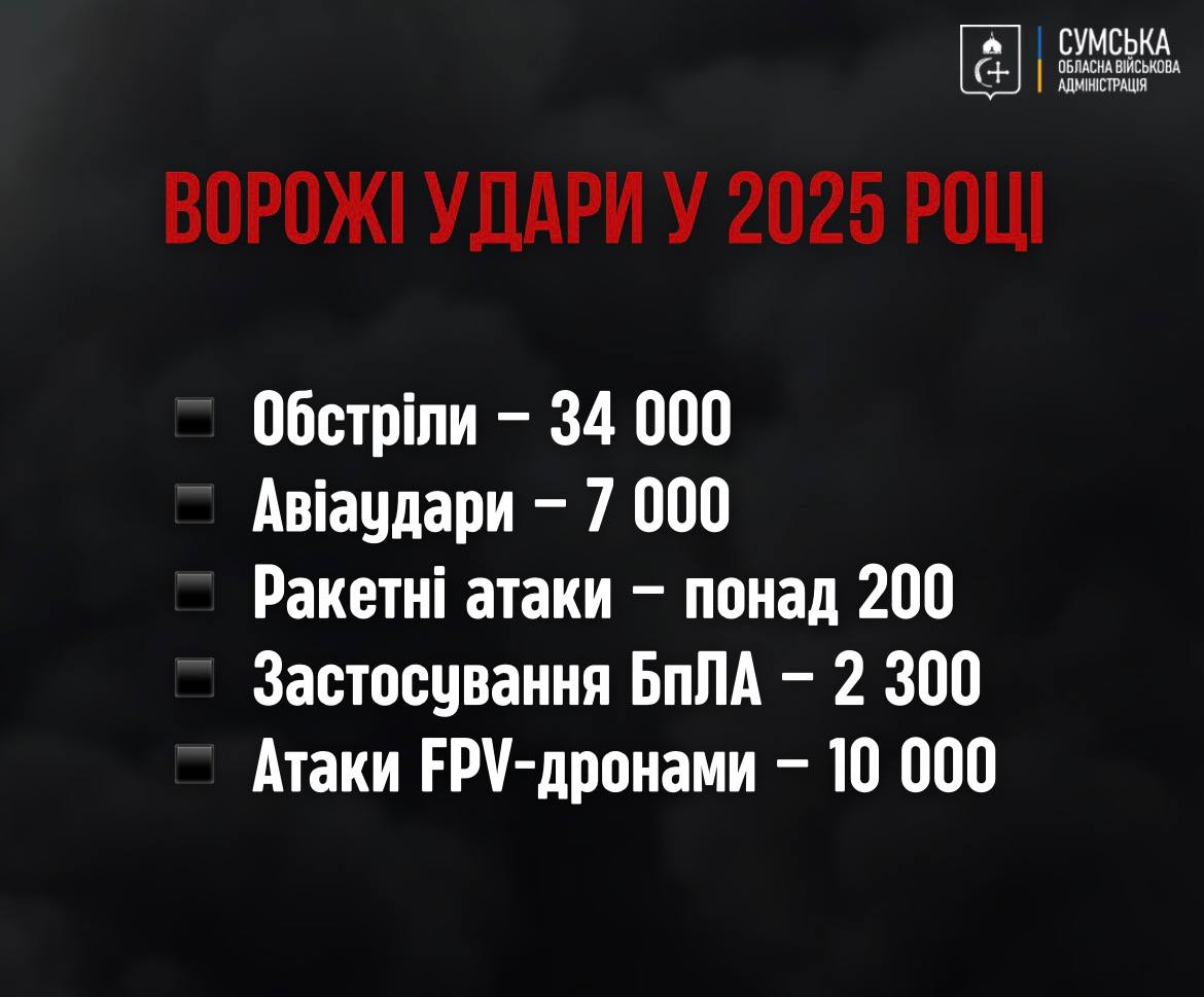 Інтенсивність ворожих атак на Сумську область у 2025 році зросла майже вдвічі порівняно з 2024-м. Під ударами перебували всі прикордонні райони, а також міста й села в глибині регіону.