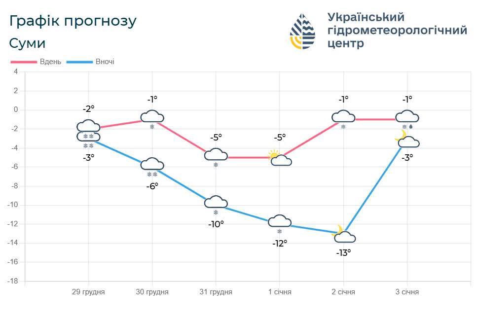 2 січня: Пік нічного холоду — стовпчики термометрів можуть опуститися до позначки -13. Проте вдень почнеться тенденція до потепління (до -1).