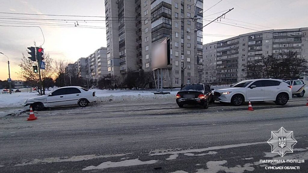 Учора, близько 16:00, на вулиці Героїв Крут сталася ДТП за участі трьох автомобілів: Mitsubishi Lancer, ЗАЗ Daewoo Lanos та Mazda CX-5, повідомляє поліція Сумської області