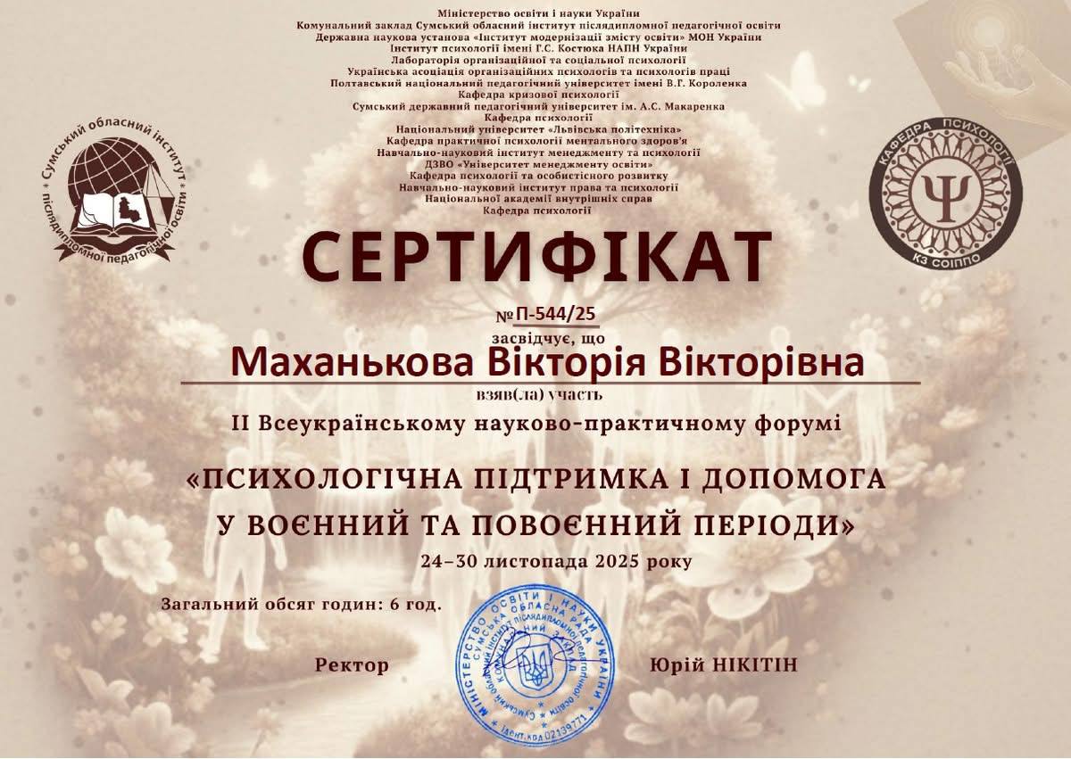 Упродовж 24–30 листопада 2025 року консультантка КУ «Путивльський центр професійного розвитку педагогічних працівників» Вікторія Маханькова взяла участь у ІІ Всеукраїнському науково-практичному форумі «Психологічна підтримка і допомога у воєнний та повоєнний періоди», – інформують у міськраді.