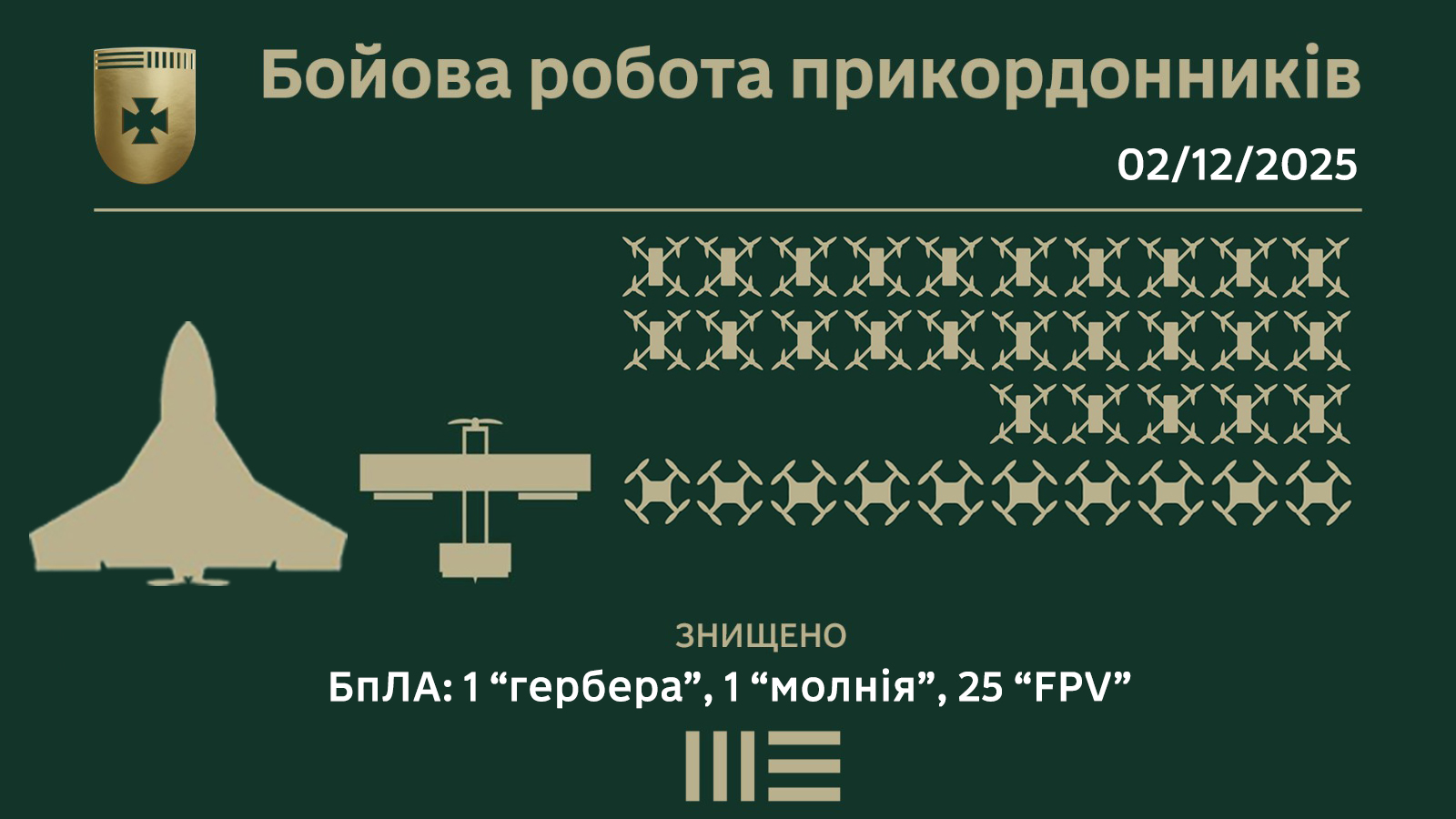 За минулу добу прикордонники збили два ворожі безпілотники — «герберу» та «молнію». Крім того, за останні дві доби військовослужбовці загону ліквідували ще 25 FPV-дронів, серед яких 10 — керовані оптоволоконними системами.