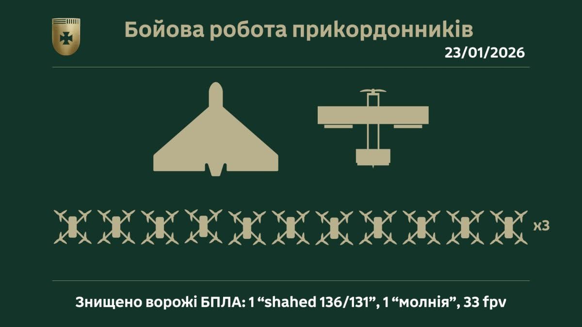 Упродовж минулої доби військовослужбовці 5 прикордонного загону в ході вогневої роботи знищили ударний безпілотник типу Shahed 131/136, а також 23 ворожі FPV-дрони.