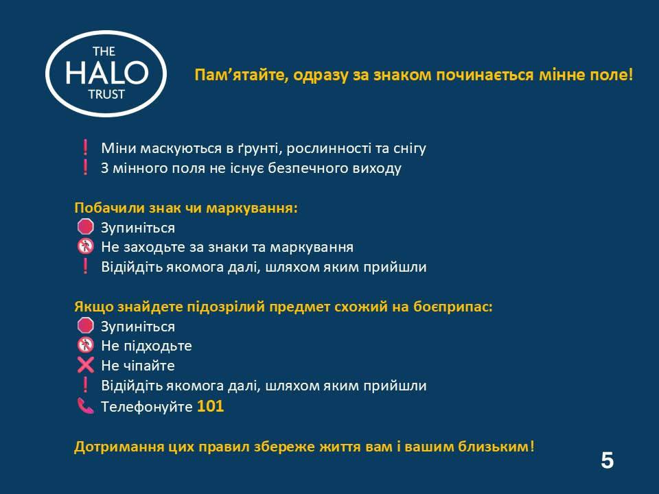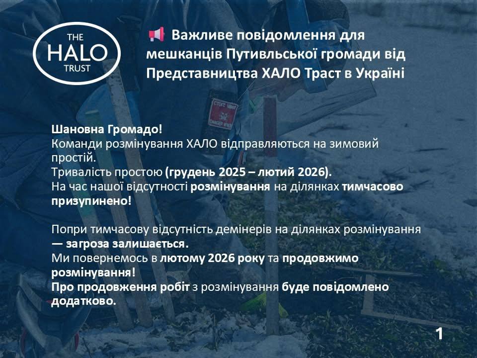 За інформацією Представництва HALO Trust в Україні, команди демінерів відправляються на зимовий простій, який триватиме з грудня 2025 року по лютий 2026 року. У цей період розмінування на визначених ділянках буде тимчасово зупинено.