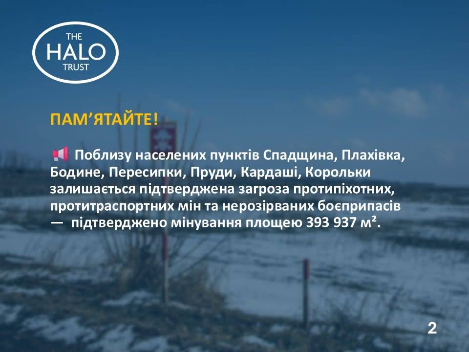 У HALO Trust нагадують, що поблизу  населених пунктів Спадщина, Плахівка, Бодине, Пересипки, Пруди, Кардаші, Корольки зберігається підтверджена загроза протипіхотних і протитранспортних мін, а також нерозірваних боєприпасів. Підтверджено мінування території площею 393 937 м².