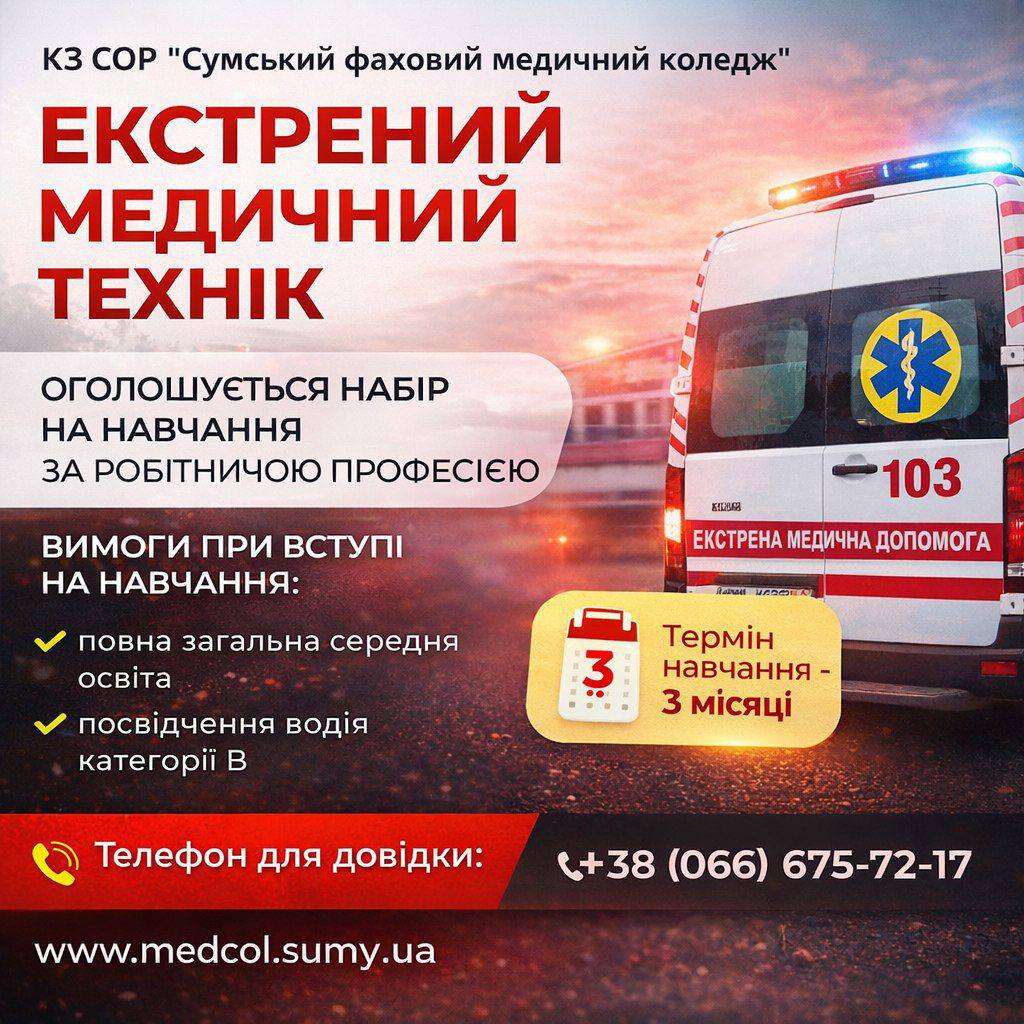 КЗ СОР «Сумський фаховий медичний коледж» відкриває набір на спеціалізоване навчання за професією «Екстрений медичний технік». Це можливість отримати фахові навички для роботи в системі екстреної медичної допомоги.