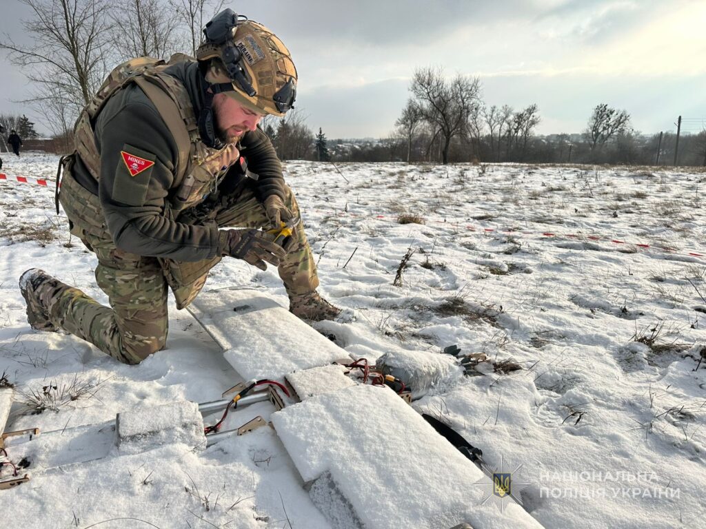 Небезпечну знахідку виявив місцевий житель на засніжених луках поблизу річки та одразу повідомив про це правоохоронців. На місце події оперативно прибули вибухотехніки поліції, які оглянули безпілотник та встановили, що його бойова частина складалася з двох мінометних мін калібру 82 мм і мала значну уражаючу силу уламками у разі вибуху.