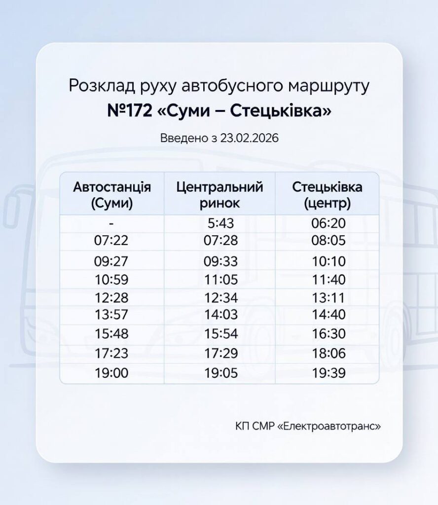 Змінюється графік руху автобуса №172 «Суми–Стецьківка»